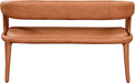 Modernize your home with this Sylvester cognac vegan leather bench. Featuring soft and durable cognac vegan leather upholstery, this bench offers you a comfortable and long-lasting place to sit while you dine. It's fully upholstered, giving it a solid look that is ideal for any contemporary home. Its rounded back provides upper back support, while its semi-open design makes a fashionable decorative statement that is sure to catch the eyes of anyone who joins you for dinner.