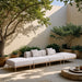 Sleek lines and soft water-resistant fabric bring contemporary style to the Laguna outdoor patio modular sofa. Crafted with a natural teak finish aluminum frame and quick-dry foam, it's built for ultimate outdoor relaxation. Rearrange or add to the set for endless configurations, creating a versatile lounging experience tailored to your space.