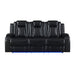 Experience the epitome of comfort and style with the Orion Sofa. Crafted with a blend of hardwoods and manufactured wood, its durable frame ensures long-lasting strength. Sink into the soft embrace of its upholstery, a blend of polyester and PU for a luxuriously supple feel. Thanks to top-quality reclining mechanisms, relaxation is effortless as you lean back into plush seating supported by high-density foam and pocket coil cushions wrapped in Dacron. Expert tailoring is evident in the sleek design, accentuated by white contrast stitching and a distinctive diamond pattern on seats and arms. Lift up pillowed arms reveal convenient storage compartments, while theater lighting along the base and reading lamps under the center headrest create the perfect ambiance. With a drop-down center back cushion housing wireless charging pads and USB charging ports, convenience meets contemporary elegance in the Orion Sofa
