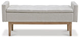 Contemporary style gets practical with this bench. The tufted beige seat cushion is hinged to allow easy access to whatever you need to hide in plain sight. Raised edges give the impression of arms, while the light brown finished wood legs help it blend with many different modern styles.
