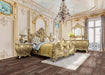 Majestic and regal, the Cabriole bed delivers on this promise. This superb bed features a PU tufted headboard with crystal-like buttons to up the glam. This refined bed is elegantly adorned with floral and leaf motifs that are sure to leave a lasting impression. Gorgeous, gilded gold finish that is fit for a King and his Queen.