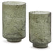 | Details | Set of 2, Made with sanded glass, Green finish, Each holds a 3” pillar candle (candles not included) | |