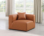 Elevate your space with the luxurious Cube Vegan Leather Corner Chair. This corner chair exudes modern elegance, charm, and comfort making it a perfect addition to any contemporary living space. Its clean lines and cube shape are reminiscent of minimalist design, while the plush cognac vegan leather upholstery adds a touch of luxury and sophistication. The chair's versatile construction and geometric aesthetic seamlessly integrate into various design styles, from sleek living rooms to chic home offices, embodying the essence of modern design and creating a sense of order and tranquility in your space.