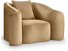 Indulge in pure luxury with the Destin camel velvet accent chair, featuring plush, oversized cushions and soft velvet upholstery for optimal comfort. Wrap yourself in comfort with a structural masterpiece offering a refreshing yet timeless aesthetic. The organic curves and plush velvet create a truly unique and eye-catching design.