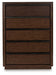 Casual contemporary styling with a decidedly modern vibe. This chest of drawers is warm and inviting with a rich dark brown finish, adorning your restful retreat with on-trend elegance. Full-length metal pulls in a matte black finish add a subtly cool touch to spacious storage drawers. What a simply stunning way to achieve the bedroom of your dreams.