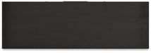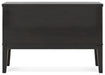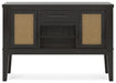 | Details | Made with hardwood solids and thick rustic oak veneer, Aged black finish with rubbed-through edges, Synthetic cane door accents, 2 cabinets; 1 adjustable shelf behind each door, Center drawer with fully finished interior, felt-lined bottom and ball-bearing side glides, Reversible wine rack shelf | |