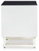 Combining a high-gloss white finish with a black glass tabletop, the Gardoni end table proves opposites really do attract. It's the perfect blend of modern style and functionality, with a spacious drawer and open cubby for keeping media needs close at hand. What a smart choice on so many levels.