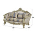 Exclusively designed and filled with romantic spirit, this beautiful loveseat features Queen Anne legs and carved aprons and trim, decorated with raised and scrolled floral motifs in a golden ivory finish. Each piece of this sophisticated living room set boasts of curved and rolled arms, oversized molding and crystal-like button tufted backrests with nailhead trim. This three piece collection with contrasting accent pillows will bring sophistication to your living room and will add elegance to any room Decor.