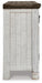 | Details | Made of wood, veneer and engineered wood, Two-tone finish with distressed weathered gray top on vintage white case, 4 doors, 2 adjustable shelves in right and left cabinets, Single adjustable shelf behind center glass front doors, Open center cubby space, Cutouts for cord management, Assembly required | |