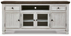 Have your fill of modern farmhouse style with this TV stand. Its distressed two-tone finish pairs a vintage white with a weathered gray for a look that’s utterly charming. Right and left cabinets open to reveal adjustable shelving for all your entertainment center storage needs. Center glass doors add to its relaxed appeal.