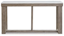 This sofa table is simple in design but big on style. Finished with a trend-right grayish brown wood tone, its bold, blocky profile and natural marble top are timeless, classic choices. This table is ideal for pairing with an ottoman to pull extra seating into the room, or for remaining clean and sleek on its own.