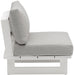 Create your own custom contemporary look on the deck or porch with the addition of this Maldives outdoor patio armless chair. Part of a large collection that lets you mix and match modular pieces to get the look you crave most. This armless chair has water resistant fabric with a base made from white aluminum, so it's sturdy, tough, and ready to face the elements with impeccable beauty, season in and season out. Shop the contemporary pieces in this collection to create the outdoor entertaining area of your dreams.