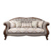 • A new addition to Acme's collection of exclusive designs, the Miyeon sofa in cherry finish is full of handsome details. Nailhead trim along the padded seat base runs up the scrolled arms and arched seatbacks. Button tufting on the seatback makes the fabric upholstery look especially cozy. Raised floral motifs embellish the Queen Anne legs of the piece.