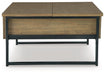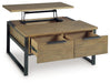 Give your space a sleek, urban edge with this lift-top coffee table. A light brown wood-tone finish and a contrasting gunmetal gray frame create a modern mixed-material look that pairs effortlessly with today’s sofas and sectionals. The spring-lift top glides up to create a convenient workspace or dining surface, while dual smooth-gliding drawers keep remotes, tech and clutter neatly out of sight. This table is polished, put together and needs a good home.