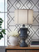Those who delight in the beauty of a bygone era are sure to be charmed by this richly traditional table lamp. Its base is detailed with ornate patterns and embellished with gracefully curved handles. An antiqued black finish lends a look that’s aged to perfection.