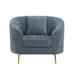 Spark memorable conversations with the sublime curved back Nakendra chair. Finely upholstered in soft, cobalt blue chenille and generously padded in dense foam, creating a premium seating experience for you and your guests. This tailored statement piece is perfect for the modern living room, entryway, lounge area, or bedroom. Doubling as an accent chair for your extra seating needs in your home or apartment, sublime comes positioned on four tapered and Splayed gold metal legs with non-marking foot caps.