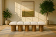 Bring valuable seating and remarkable style to your space with this Pavilion boucle fabric bench, an exquisite balance of style and usability for the entryway, bedroom, and beyond. Crafted from oak veneer with a walnut brown finish, this bench has a 4-inch-thick seat cushion that's channel-tufted for a touch of luxury. The bench's columnar bases add a dash of art deco design, making it a captivating focal point in any room.