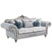 Create a more luxurious and comfortable living room with this classic Pelumi sofa. This living room sofa features a wooden design with platinum wooden trimmings. The sofa comes with pocket coil seating for comfort. The back is cushioned and designed with a camel back silhouette. Upholstered in light gray linen fabric for an airy touch. Eight accent pillows are included with the sofa. The rolled arms and tapered legs give this piece an antique look.