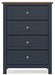 Add homespun charm to your restful retreat with this bedroom package. A modern take on timeless silhouettes, it pairs a dark slate blue finish with light brown tops. Drawer fronts and legs in a classic Shaker style bring an air of beautiful simplicity to the bedroom. Whether it's part of a charmingly curated guest suite or a casually carefree kids room, this set is a welcome addition.