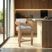 Elevate your counter seating with the Sacha linen textured fabric upholstered counter stool, a perfect blend of refined texture and timeless craftsmanship. Wrapped in rich polyester linen-textured fabric with a striking two-tone weave, this stool offers both depth and sophistication. The solid wood frame, finished in a natural tone, showcases elegant fluted detailing, adding a touch of classic artistry.