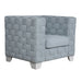 The Saree chair uses simple lines to create a striking boxed-shaped silhouette. This chair delivers a unique aura into any living space with its light teal chenille and white finish. It is designed using a unique knitting process that adds texture and depth; this makes the pieces bold and lively in appearance. The pocket coil seating makes it luxurious to lounge on.