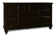 The Sevilla 9-Drawer Dresser in walnut is a masterpiece of timeless craftsmanship and versatile design, making it a stunning addition to any bedroom. Skillfully crafted from solid Acacia wood and Acacia veneers, this dresser features a rich, hand-distressed walnut finish that gives it a warm, vintage appeal. The dresser's sturdy construction and substantial presence command attention, while its elegant design blends traditional, rustic, and colonial styles, creating a cozy and inviting ambiance. The nine spacious drawers are equipped with masterful dovetail joinery and smooth interiors for snag-free storage, gliding effortlessly on precision-engineered, full-extension drawer glides. Thoughtful details include luxurious velvet-lined top drawers to protect your valuables and a removable jewelry caddy nestled in the top center drawer, adding both elegance and functionality. Perfectly balanced between style and durability, this dresser serves as a captivating focal point in any classic, cozy, or historically inspired space.