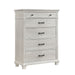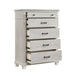 The Silver Sands Chest is built with durable, quality construction using solid pine, manufactured woods, and oak wood veneers, ensuring a strong and stable piece. Its transitional style blends clean, simple lines with a rustic wood finish, creating a calm and inviting atmosphere. The misty gray finish, applied through a meticulous multi-step process, offers a light, weathered look that highlights the natural grain and mineral patterns of the wood. Elegant design features, including a raised base, full return and dentil moldings, and contrasting hardware, add a sophisticated touch. Heirloom-quality drawers with dovetail joinery and three-stage steel ball glides ensure smooth, full-extension operation and can support heavy loads. With five spacious drawers, including a velvet-lined top drawer to protect delicates, this chest provides ample storage for clothing essentials. Combining style, durability, and functionality, this chest is a practical and elegant addition to any bedroom.