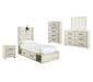 | Details | B192-46: Made of engineered wood (MDF/particleboard) and decorative laminate, Wispy white finish over replicated oak grain with authentic touch, Large-scale hardware with dark finish, 5 smooth-gliding drawers, Drawer interiors are lined with a faux linen laminate for a clean, finished look, Safety is a top priority, clothing storage units are designed to meet the most current standard for stability, ASTM F 2057 (ASTM International), Drawers extend out to accommodate maximum access to drawer interior while maintaining safety, B192-92: Made of engineered wood (MDF/particleboard) and decorative laminate, Wispy white finish over replicated oak grain with authentic touch, Large-scale hardware with dark finish, 2 smooth-gliding drawers, Drawers lined with faux linen laminate for finished aesthetic, 2 slim-profile USB charging stations, Power cord included; UL Listed, B192B1: Includes dresser with mirror, Made of engineered wood (MDF/particleboard) and decorative laminate, Wispy white finish over replicated oak grain with authentic touch, 6 smooth-gliding drawers, Drawer interiors are lined with a faux linen laminate for a clean, finished look, Large-scale hardware with dark finish, Mirror attaches to back of dresser, Assembly required, B192B21: Includes headboard, footboard, side storage, rails and slats, Made of engineered wood (MDF/particleboard) and decorative laminate, Wispy white finish over replicated oak grain with authentic touch, Large-scale hardware with dark finish, Decorative sconce light, LED with 3 AA batteries, 4 smooth-gliding storage drawers, 4 storage cubbies, 2 slim-profile USB charging ports, Power cord included; UL-listed, Bed does not require additional foundation/box spring; accommodates most zero clearance adjustable bases with the addition of a bunkie board, Mattress available, sold separately, Assembly required, | |