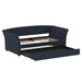 The Vienna daybed is a versatile addition to any space, whether it's a home office or a studio apartment. Its flared arms and gently curved back are upholstered in a navy blue woven fabric, offering a stylish look. By day, pile on the pillows to create the perfect lounging spot; by night, pull back the covers for a cozy bed. The convenient trundle pulls out effortlessly, serving as hidden storage with a divider bar or accommodating a second twin mattress for overnight guests. Enjoy the extra functionality and charm the Vienna daybed will bring to your home.