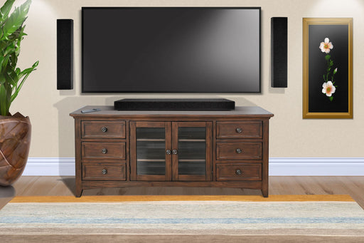 Sunny DesignsThis 70" TV console was built with rough sawn mahogany solids and veneers with glass doors and was beautifully finished. 70" TV Console - Marble Wh...