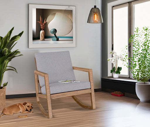 This item is a contemporary rocking chair that combines comfort with a stylish, modern design. The chair features a light wood frame with clean, ge...