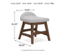 Details H615-44: Made with rubberwood solids, mango wood veneer and MDF substrate, Medium brown natural wood-tone finish, 3 drawers with fully finished interior, dovetail construction and ball-bearing side glides, Cutout for cord management, Open raceway for power cord management, Round tapered legs, H615-01: Made with solid hardwood frame, Medium brown natural wood-tone finish, Polyester upholstery, Foam cushion,