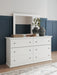 | Details | B139B42: Includes panel headboard/footboard and rails, Made with engineered wood (MDF/particleboard/plywood) and decorative laminate for the right balance of affordability and durability, Replicated solid white paint, Decorative laminate replicates natural or man-made material surfaces with consistent color, pattern and texture, Foundation/box spring required, sold separately, Mattress available, sold separately, Assembly required, B139B40: Includes dresser and mirror, Made of engineered wood (MDF/particleboard), Knobs with pewter-tone finish, Scalloped moulding, 6 smooth-operating drawers, Includes tipover restraint device, Mirror attaches to back of dresser; can also be mounted on wall horizontally or vertically, Safety is a top priority, clothing storage units are designed to meet the most current standard for stability, ASTM F 2057 (ASTM International), Drawers extend out to accommodate maximum access to drawer interior while maintaining safety, | |