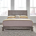 Accent your bedroom with the perfect farmhouse design, using this unique and stylish king platform bed. Crafted with rubberwood solids and knotty oak veneers, this piece features bolt on rails, a platform footboard, and a geometric pattern. This bed does not require a box spring, allowing a true platform feel. The all-over dusty finish accompanied by heavy distressing sets this piece apart from the rest of the collections.