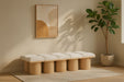 Bring valuable seating and remarkable style to your space with this Pavilion boucle fabric bench, an exquisite balance of style and usability for the entryway, bedroom, and beyond. Crafted from oak veneer with a natural finish, this bench has a 4-inch-thick seat cushion that's channel-tufted for a touch of luxury. The bench's columnar bases add a dash of art deco design, making it a captivating focal point in any room.