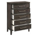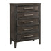 The Andover Five Drawer Wood Chest combines durability, functionality, and modern rustic style, making it an essential piece for any bedroom. Expertly crafted from solid Rubberwood, manufactured woods, and wood veneers, this chest is built to last while highlighting the natural beauty of real wood. The rich finish is the result of a meticulous multi-step process that includes sand-throughs and white glazing, imparting a weathered yet refined appeal that enhances the wood's natural grains and unique characteristics. The Andover chest’s clean lines and cohesive design are complemented by sleek, elongated metallic handles that add a sophisticated contrast to the dark wood finish. Framed drawer fronts add depth and dimension, while the sturdy block-style legs ensure a solid foundation that underscores the chest's robust and enduring structure. The drawers glide smoothly on Kenlin drawer glides, ensuring reliable operation, and feature dovetail joinery, reflecting superior craftsmanship and lasting quality. This chest offers ample storage space while enhancing your bedroom's aesthetic with its timeless and versatile design.