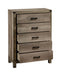 This modern bedroom collection features a clean-lined design with a stylish weathered gray finish. Sturdy and practical, each piece is equipped with ample storage and smooth metal hardware. The bed's bold headboard is a standout element, making it the focal point of the room. This set is perfect for anyone looking to add a touch of contemporary sophistication to their bedroom without sacrificing functionality.