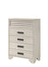 This bedroom collection radiates contemporary charm with its light wood finish and minimalist design. The bed, with its clean lines and louvered headboard, offers a modern twist on a classic design, creating a serene focal point in the room. Complementary pieces include a spacious dresser topped with a large mirror that adds depth and brightness to the space, a tall chest providing ample vertical storage, and a nightstand with convenient bedside access. Each piece is accented with sleek, dark hardware that stands out against the light finish, adding a subtle contrast that is both striking and elegant.