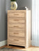 The natural wood tones and clean lines of this chest of drawers echo your easygoing style sensibilities. With a warm finish and replicated oak grain, its carefree character lightens up your bedroom. Curved inner corner details soften the look, while sleek bronze-tone hardware modernizes the feel.