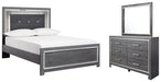 Details B214B1: Made of engineered wood (MDF/particleboard) and decorative laminate, Gray finish with replicated wood grain, Faceted chrome-tone pulls and accents, 6 smooth-operating drawers, Drawers lined with faux linen laminate, Mirror attaches to back of dresser, Includes tipover restraint device, Assembly required, B214B4: Includes headboard, footboard and side rails, Made of engineered wood (MDF/particleboard) and decorative laminate, Gray finish with replicated wood grain, Faux leather upholstery, Faux crystal and faceted chrome-tone metal accents, Accent LED lights with remote to control color and brightness, Power cord included; UL Listed, Mattress and foundation/box spring available, sold separately, Assembly required, Bed is compatible with an adjustable base,