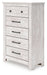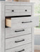Details Made with engineered wood (MDF/particleboard/plywood) and decorative laminate for the right balance of affordability and durability, Whitewash replicated worn through paint over replicated wood grain with authentic touch, Decorative laminate replicates natural or man-made material surfaces with consistent color, pattern and texture, Hardware with dark bronze-tone finish, 5 smooth-gliding drawers, Safety is a top priority, clothing storage units are designed to meet the most current standard for stability, ASTM F 2057 (ASTM International), Drawers extend out to accommodate maximum access to drawer interior while maintaining safety, Minor assembly required