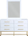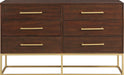 Inject bold, modern styling into your bedroom with this Maxine dresser. The dresser's contemporary design is nothing short of stunning, with unassuming lines and eye-grabbing hardware. A rich finish is modish and up-to-the-minute, while the brushed metal legs and drawer handles give this unit added flair. A metal base raises the dresser from the floor for a noticeably upscale vibe. Fill this dresser's drawers with essentials for keeping your bedroom space clean and neat.