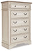 Elevating the art of traditional cottage styling, this chest of drawers is your dream bedroom retreat realized. Its antiqued two-tone aesthetic blends a chipped white with a distressed wood finished top for added charm. Framed drawer fronts and decorative corbels add refinement, while bail pulls in a dark bronze-tone finish lend a classic touch.