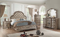 The Northville traditional design of this collection is distinguished by flowing lines and decorative details on every piece-curved fronts and tops, acanthus leaf accents, elaborately carved bracket feet and ornate pulls in an antique renter finish. The translucent platinum finish accentuates the graining of its rubber wood solids and oak veneer construction. The bed's headboard accent the finish covered by a button tufted PU. Attention to detail continues in the spacious felt-lined drawers. Enjoy the relaxing and lavish environment! Case pieces have shaped tops and fronts, picture frame molding with inner decorative scroll work molding, egg and dart molding detail top and bottom, captured panel side panels with decorative scroll work molding, canthus leave detail on the pilasters and heavily detailed feet.