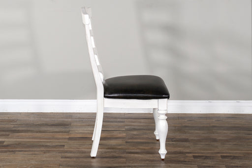 Sunny DesignsThis ladder-back dining chair features a black vinyl cushion seat. Constructed with wire-brushed wooden frame legs and rustic charm, this side chai...