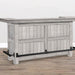 This Alpine bar was crafted with distressed mahogany solids and veneers. The planked old-world design complements its gorgeous alpine grey finish and features an under-top pull-out tray and wine and glass storage.