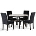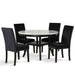 The Celeste 5-Piece Dining Set is an exquisite combination of modern sophistication and enduring craftsmanship. This set includes a chic round table with an espresso base and a faux marble top, accompanied by four stunning black velvet chairs. Crafted from solid Rubberwood and high-quality manufactured wood components, the dining set is designed for longevity, ensuring a lasting addition to your dining space. The glossy finish on the tabletop provides both heat and water resistance, ensuring easy cleaning and protection from wear. The white and gray veined faux marble top, complemented by deep espresso legs, creates a contemporary and glamorous ambiance. Luxurious seating awaits with the soft and durable 100% polyester velvet fabric covering sumptuous memory foam cushions, offering both comfort and easy maintenance. Tailored for elegance, the rich and luxurious colors of the velvet chairs are enhanced by silver nailhead trim, providing a sparkling final touch to this impeccable dining set. Elevate your dining experience with the Celeste dining set—a fusion of contemporary glamour and enduring quality.