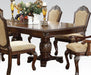 The Chateau De Ville traditional dining collection features elegant styling decorative carving and a combination of exotic materials. The double pedestal dining table with extended two leaves is accented by decorative base and feet. Matching hutch and buffet reflects all carefully selected design features as the dining collection. This collection will be the showpiece of your dining room environment.