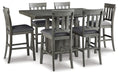 Cool and on-trend. This counter-height dining package sports an antiqued gray finish and gray textural fabric for a contemporary-yet-casual feel. The table features a storage base and removable leaf for extra seating room, making it a breeze to clear off clutter and expand your table space. Comfortably cushioned, the barstool features a padded seat, while its contoured comb-back design adds a dash of geometric flair. With this set, it's easy to dine in style.