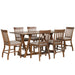 The Putnam Wood Counter Height Dining Set offers a perfect blend of quality craftsmanship and modern design. This set includes a counter-height table and counter chairs, all crafted from solid rubberwood, manufactured woods, and Acacia wood veneers for a stable and long-lasting dining experience. The warm walnut finish is achieved through a meticulous multi-step process that enhances the natural beauty and grain patterns of the wood. The table features mid-century modern design elements with clean lines and a simple rectangular shape, complemented by uniquely shaped legs that add a geometric flair. Measuring 78" in length, it comfortably seats up to six people, making it ideal for family gatherings and entertaining. The counter chairs are designed with ergonomic contours and high-density foam cushions covered in premium 100% polyester fabric, providing exceptional back support and comfort. Choose the Putnam Dining Set for a stylish, comfortable, and enduring addition to your home.
